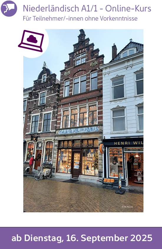 Ob Niederländisch für den Urlaub oder wegen Familie und Freunden, für den Beruf oder den Einkaufsbummel: Es gibt viele Gründe, Niederländisch zu lernen, aber der wichtigste ist wohl, dass es einfach Freude macht. Dieser Onlinekurs bietet eine Einführung in die niederländische Sprache und Kultur für Anfänger*innen ohne Vorkenntnisse. Der Kurs vermittelt einen ersten Einstieg in die Aussprache, Grammatik und den Wortschatz, damit man Alltagssituationen in den Niederlanden oder in Flandern sprachlich bewältigen kann.