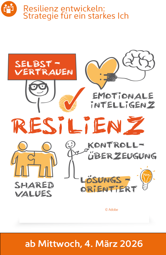 In diesem Kurs lernen Sie in acht Terminen, wie Sie Ihre seelische Stärke festigen und ein starkes „Ich“ aufbauen können. Es gibt Tipps und Übungen, die dabei helfen, sich selbst besser zu verstehen und gut mit Rückschlägen umzugehen.