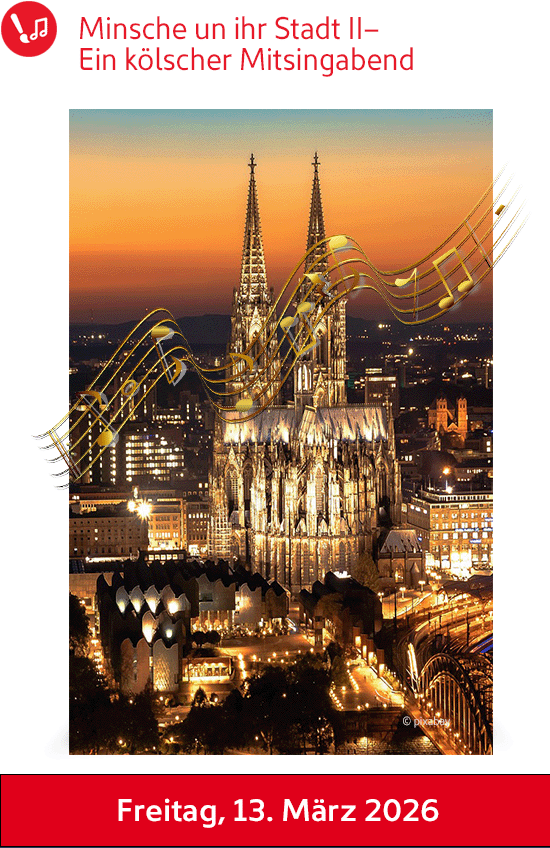 Lieder aller Art gehören in Köln zum Alltag und zum Feiern – und auf keinen Fall nur in den Karneval. Ob bei der „Kinddäuf“, beim „Polterovend“ oder beim „Buuredanz“, in der „Kaffeebud“ oder im „Waschsalon“, bei den „Schusterjungen“ oder beim „Kölsche Lohengrin“ - überall singen die Kölner gern und laut. Gemeinsam lassen wir die schönen Lieder „vum Ostermann, vum Berbuer, vun de Bläck Fööß un de Höhner“ aufleben.