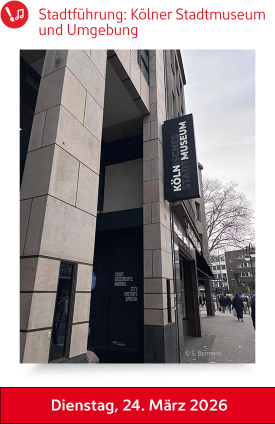 261-2372 Leitung: Wilfried Weber Köln Treffpunkt: Eingang Stadtmuseum Minoritenstraße 13 Di., 24.03.2026 16:00 – 18:00 Uhr max. 20 Teilnehmer 16,50 Euro k. E. Anmeldung schriftlich bis 13.03.2026 |