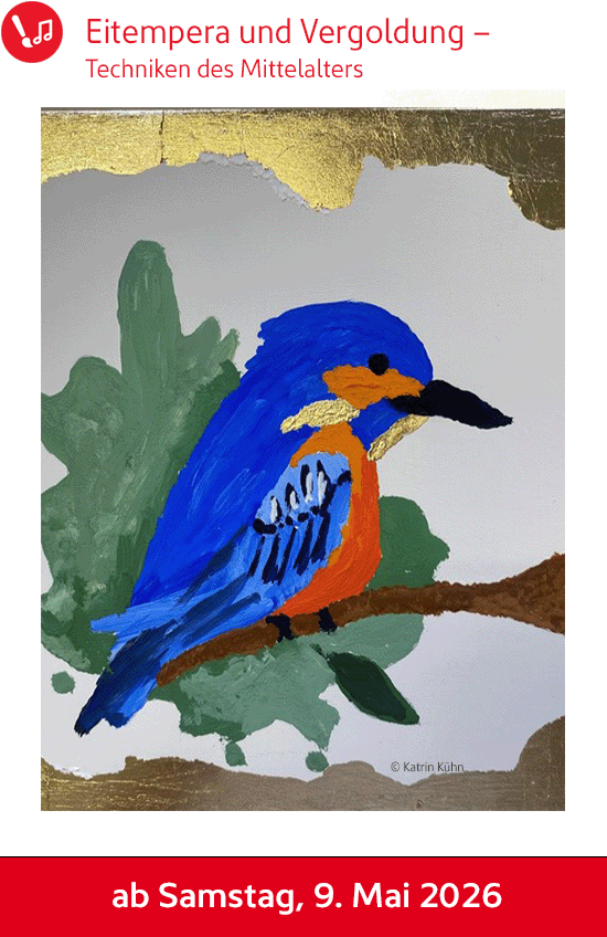 Der Kurs versetzt Sie in die Zeit der europäischen Tafelmalerei des Mittelalters. Sie bekommen einen Einblick in den kunsthistorischen Hintergrund sowie die Herstellung und den Aufbau der Mal- und Verzierungstechniken. Sie lernen die Eitempera, eine besonders strahlende Farbe, kennen und gestalten mit eigens hergestellten Farben ein Motiv (vorgegeben oder individuell) auf einer kleinen, grundierten Tafel. Die kann an Tag 2 mit Steinen und Ornamenten verziert und mit Schlagmetall vergoldet werden.