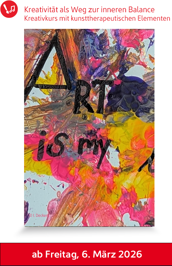 In diesem Kurs steht nicht das künstlerische Ergebnis im Vordergrund, sondern der kreative Prozess selbst. Mit Farben, Formen, Collagen und unterschiedlichen Materialien malen und gestalten wir zu vorgegebenen Themen, die Impulse zur Selbsterfahrung und zum Austausch geben und stärken dabei unsere eigene Ausdruckskraft.