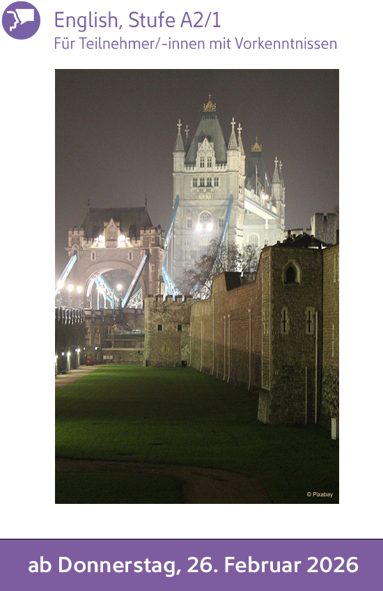 In diesem Kurs tauchen wir gemeinsam in neue Vokabeln und spannende Redewendungen ein, die Ihre Englischkenntnissen weiter verbessern. Wir üben praxisnahe Alltagssituationen, sodass Sie schon bald voller Selbstvertrauen sagen können: “I can do this!” Stärken Sie Ihr Sprachgefühl, erweitern Sie Ihre Ausdrucksmöglichkeiten und gewinnen Sie an Sicherheit. Let’s take your English to the next level!