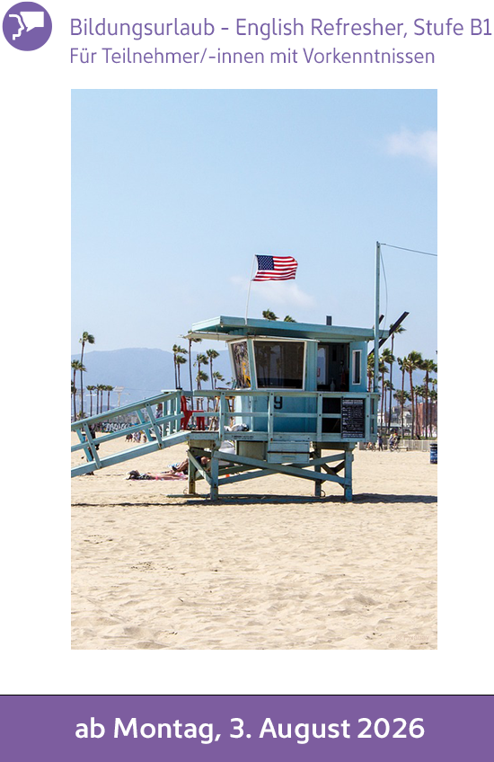 Der Bildungsurlaub richtet sich an Lernende mit Englischkenntnissen der Stufe B1, die diese festigen oder auch auffrischen möchten. In einem intensiven und praxisnahen Umfeld verbessern Sie Ihr Sprachverständnis und Ihre Ausdrucksfähigkeit. Sie lernen, Personen vorzustellen, über verschiedene Themen wie Reisen, Gesundheit, Filme, Wirtschaft und Zukunftspläne zu sprechen sowie Telefongespräche zu führen. Dabei üben Sie wichtige Grammatikthemen wie die Formulierung von Fragen und die Anwendung verschiedener Zeitformen. Gearbeitet wird hierzu mit dem Lehrbuch "A New Start - Refresher B1".