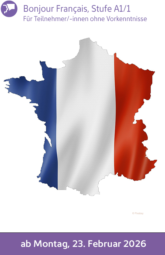 Dieser Kurs richtet sich an Anfänger/-innen ohne Vorkenntnisse, die gerne die französische Sprache erlernen möchten, um zum Beispiel im Urlaub im Kontakt mit Einheimischen alltägliche Dialoge führen zu können. Im Unterricht stehen deshalb Sprechen, Hör- und Leseverstehen sowie landeskundliche Inhalte im Vordergrund. Vokabelkenntnisse und grammatikalische Grundlagen sollen behutsam erworben werden, um auch spontan ohne Wörterbuch oder KI kommunizieren zu können und Freude daran zu entwickeln.