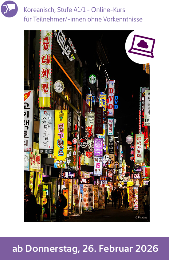Möchten Sie Koreanisch erlernen, um sich auf Reisen oder im Beruf ausdrücken zu können oder um K-Pop-Lieder mitzusingen? Dann kommen Sie und steigen Sie ein! Es sind keine Vorkenntnisse nötig. „Der Anfang ist die Hälfte des Ganzen.“ Im Kurs werden die Koreanisch Grundlagen sowie im Buch die ersten sechs Kapitel erarbeitet.